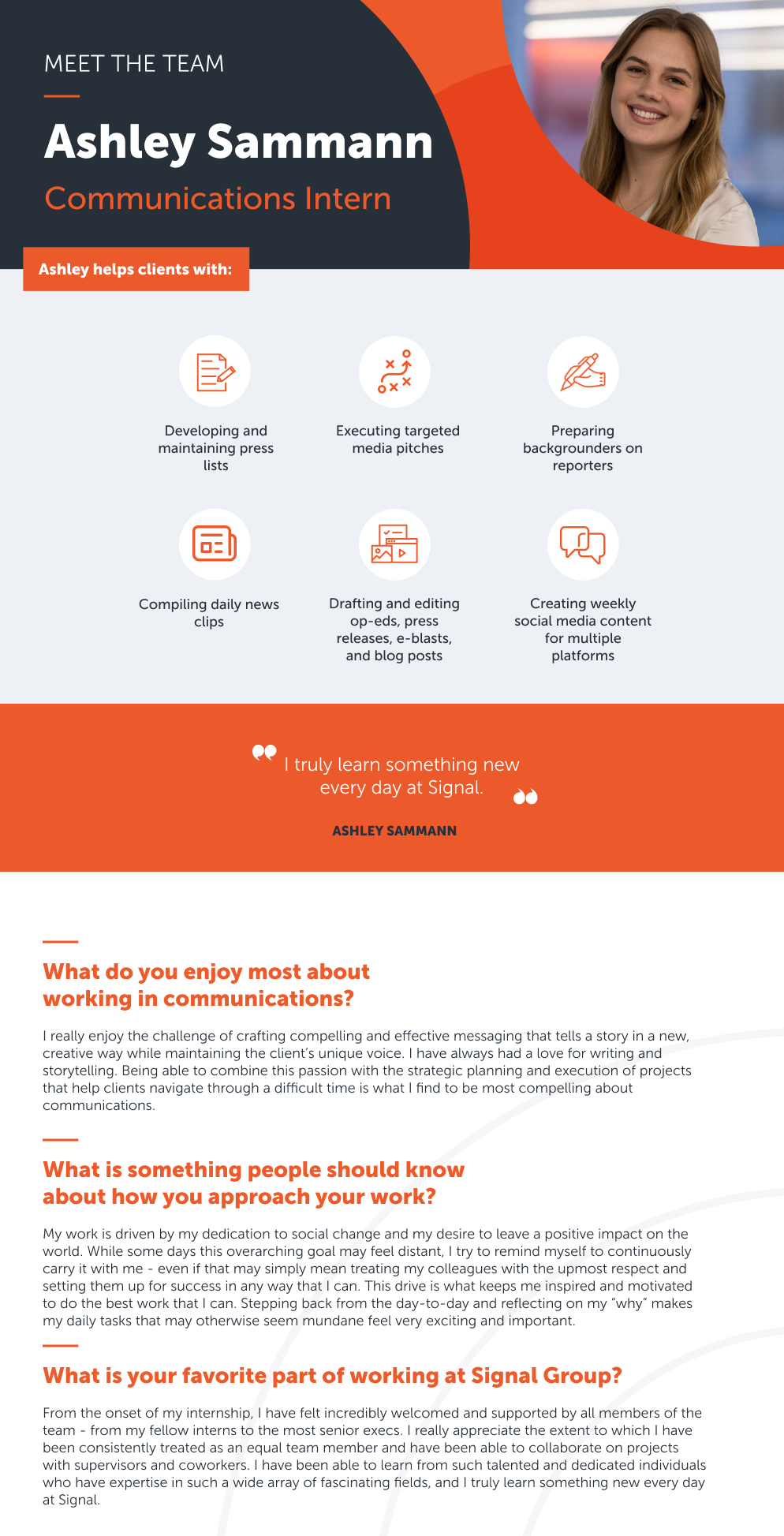 Signal’s latest spotlight features Communications Intern, Ashley Sammann, on her experience at Signal, assisting our clients in telling their stories, and expanding her skills every day.